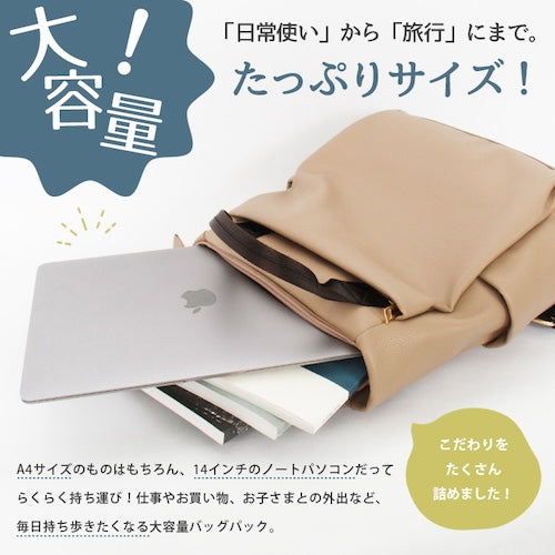 リュック リュックサック バックパック バッグ かばん カバン 鞄 ハンドバッグ 3way 収納 ポケット A4 大容量 無地 革 レザー エコレザー シンプル マチ付き レディース ベージュ グレー ブラック 黒 ブラウン キャメル 春 夏 秋 冬 オールシーズン カジュアル bl